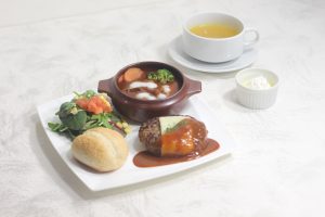 上州牛をふんだんに使ったこだわりのハンバーグ。特製デミグラスソースが美味しさをさらに引き立てます。